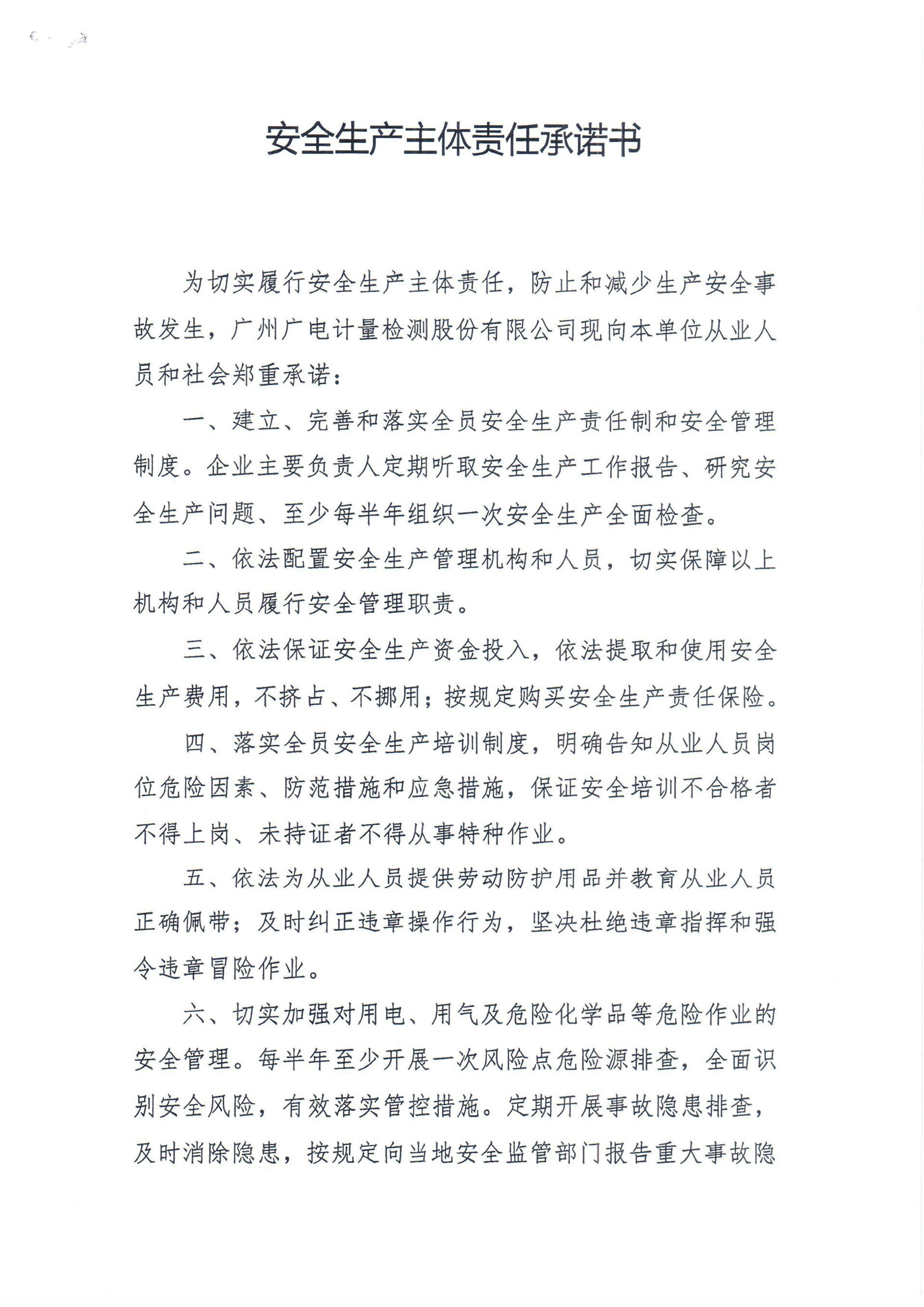 廣電計量安全生產主體責任承諾書(2018年)