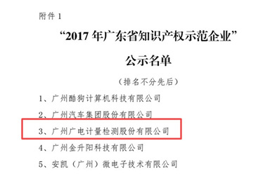 廣電計(jì)量入選“2017年度廣東省知識(shí)產(chǎn)權(quán)示范企業(yè)”名單