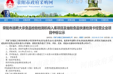 廣電計量河南子公司成功中標 “滎陽市選聘大宗食品檢驗檢測機構入庫項目及抽驗食品快速檢測卡經營企業項目”第二標段。