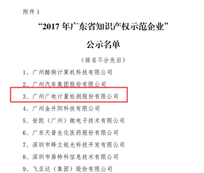 廣電計量入選“2017年度廣東省知識產權示范企業”名單