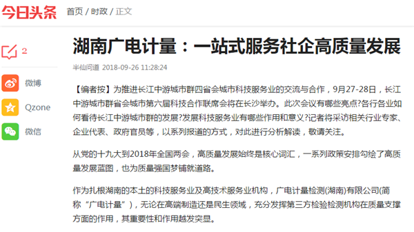 9月27日,權威媒體《長沙晚報》對湖南廣電計量在科技服務領域的做法與經(jīng)驗進行了詳細報道,今日頭條、政府部門網(wǎng)站等紛紛轉載報道,形成了廣泛的影響力。
