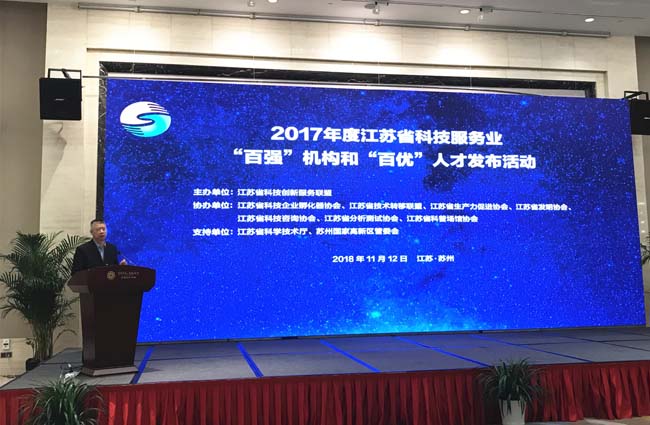 11月12日,2017 年度江蘇省科技服務業“百強”機構和“百優”人才發布活動在蘇州舉行,廣州廣電計量檢測無錫有限公司(簡稱無錫廣電計量)憑借“一站式”計量檢測技術服務,助力區域產業轉型升級、服務行業高質量發展,榮獲2017年度江蘇省科技服務業“百強”機構。江蘇省科技廳副巡視員景茂、省科技廳科技機構與條件處副處長李漢中等領導蒞臨現場,各區市科技局人員、行業組織、成員單位及獲獎機構等出席了此次發布活動。