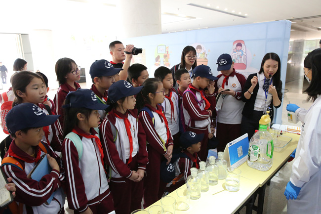 走進(jìn)互動體驗區(qū),接地氣的宣傳展板和各種有趣好玩的小實驗頓時吸引了小記者們的目光。瞬間變色實驗、火山噴發(fā)實驗、手機電磁輻射檢測……孩子們目不轉(zhuǎn)睛地盯著技術(shù)人員的操作,現(xiàn)場不時傳出陣陣驚嘆。