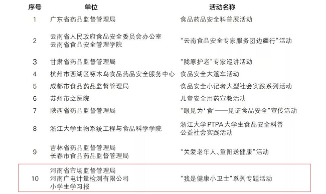 近日,原國家食品藥品監管總局新聞宣傳司、中國健康傳媒集團聯合組織的“全國食品藥品科普排行榜”獲獎榜單正式發布。由河南省市場監督管理局、河南廣電計量、小學生學習報聯合組織的“我是健康小衛士”系列專題活動榮獲“食藥科普十大傳播活動獎”。