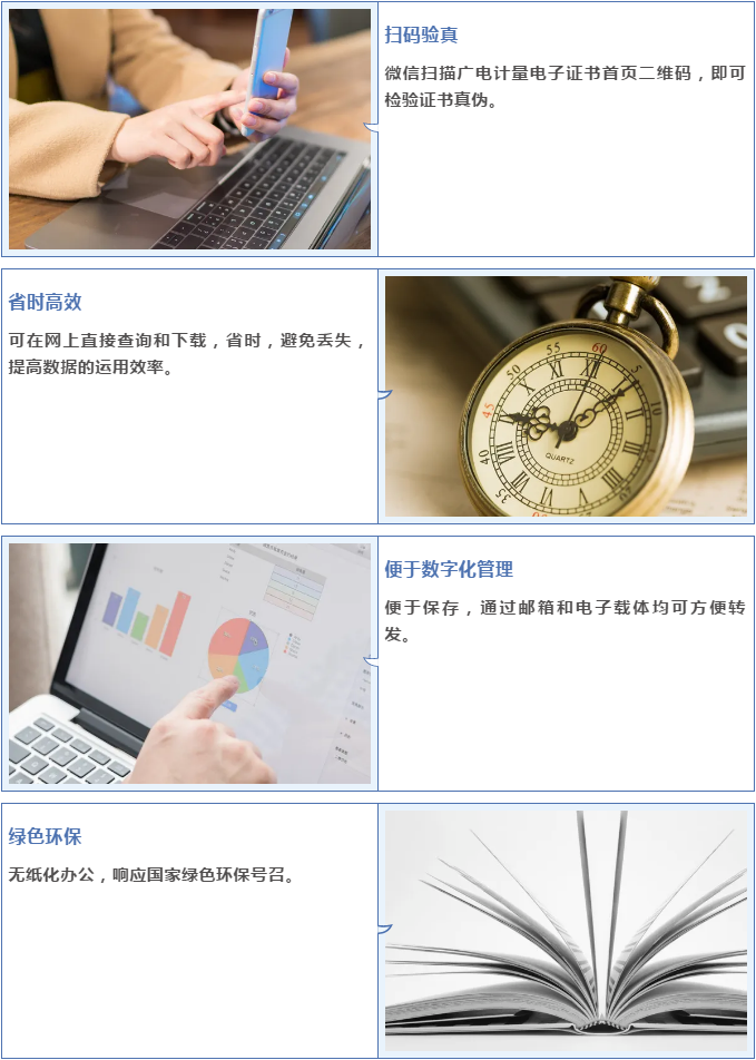 為便于客戶數(shù)據(jù)管理和查詢證書信息有效性,適應“互聯(lián)網(wǎng)+計量”的逐步推廣以及計量檢測信息化的發(fā)展需要,廣電計量依靠自身信息化建設能力,全面推行電子證書,確保質量信息真實、便捷、高效傳遞。今后,客戶可通過計量E管家、自助服務平臺、官網(wǎng)、公眾號等渠道自行查詢和下載使用,并可通過掃描證書二維碼查詢防偽信息。