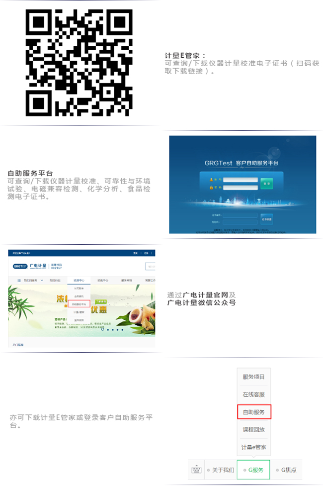 即日起廣電計量為客戶免費提供標準版的儀器設備管理軟件“計量E管家”,同時為客戶提供自助服務平臺(http://120.197.59.40:8086)、公司官網(wǎng)(m.shuangtaojd.com.cn)、微信公眾號等多種電子證書查詢、下載渠道。