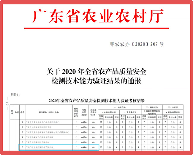 近日,廣東省農業農村廳發布《關于2020年全省農產品質量安全檢測技術能力驗證結果的通報》。本次能力驗證共有全省195個農產品檢驗檢測機構(或實驗室)參加,考核總體合格率78.5%,其中考核結果為4A 級單位19個。廣州廣電計量檢測股份有限公司參加全部項目并獲得4A級別;食品檢測實驗室李冰虹、袁浪、郭楚紅、林緒、鄧麗紅、李庚、藍夢哲等7人獲能力驗證工作優秀檢測人員表彰。