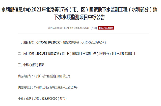 今年6月,國家水利部對(duì)2021年北京等17省(市、區(qū))國家地下水監(jiān)測(cè)工程(水利部分)地下水水質(zhì)監(jiān)測(cè)項(xiàng)目進(jìn)行公開招標(biāo),廣電計(jì)量從眾多權(quán)威檢測(cè)機(jī)構(gòu)中脫穎而出成功中標(biāo)。