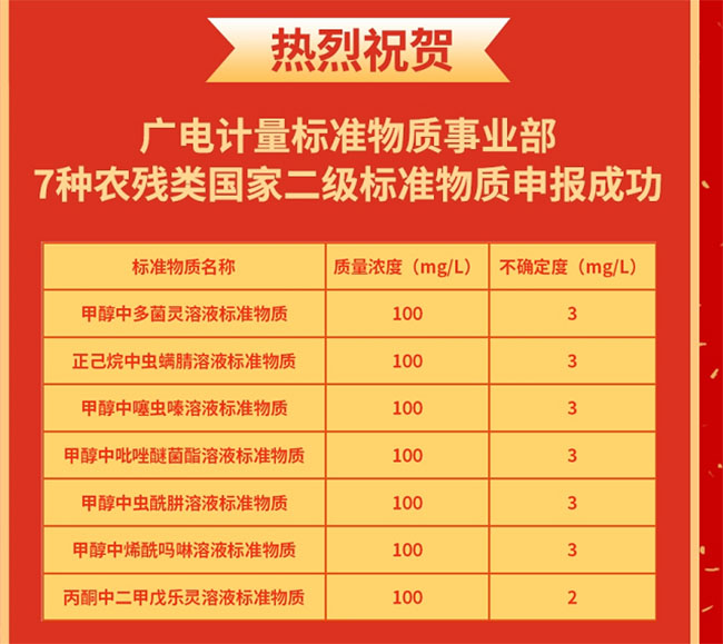 廣電計(jì)量標(biāo)準(zhǔn)物質(zhì)事業(yè)部自成立以來,持續(xù)提升質(zhì)量控制與運(yùn)行管理水平,致力于標(biāo)準(zhǔn)物質(zhì)的研制及銷售工作,目前自主研發(fā)和代理銷售的標(biāo)準(zhǔn)物質(zhì)合計(jì)超10萬種,涵蓋醫(yī)藥檢測、食品與農(nóng)產(chǎn)品檢測、環(huán)境檢測、工業(yè)品檢測、紡織品檢測等服務(wù)領(lǐng)域,助力科研院所、監(jiān)管部門、檢測機(jī)構(gòu)、生產(chǎn)企業(yè)等保存和傳遞特性量值,建立測量溯源性,保證測量結(jié)果的一致性、可比性,已成為政府監(jiān)管部門及企業(yè)的有力技術(shù)支撐力量。