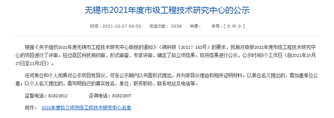 無錫市2021年度市級(jí)工程技術(shù)研究中心公示
