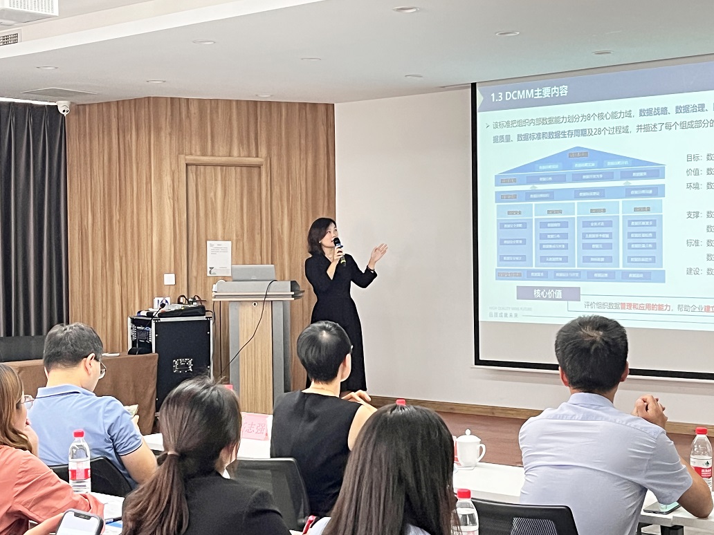 會上,青島廣電計量副總經理周美玉向與會嘉賓介紹了公司技術服務能力與發展情況。廣電計量DCMM評估負責人郭婧介紹了《數據管理能力成熟度評估模型》評估流程及評估服務解析,結合企業服務案例經驗,深入淺出地解析評估過程中的常見問題,為參會企業推進DCMM評估實施提供培訓輔導、分享實戰經驗。