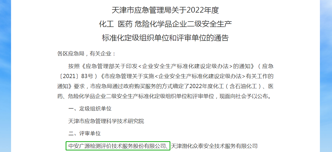 為高標(biāo)準(zhǔn)完成相關(guān)標(biāo)準(zhǔn)化創(chuàng)建工作,充分發(fā)揮技術(shù)支撐作用,全力做好政府部門和企業(yè)的橋梁,中安廣源作為天津市應(yīng)急管理局確定的化工、醫(yī)藥 、危險(xiǎn)化學(xué)品企業(yè)二級(jí)安全生產(chǎn)標(biāo)準(zhǔn)化評(píng)審單位,在此溫馨提示如下: