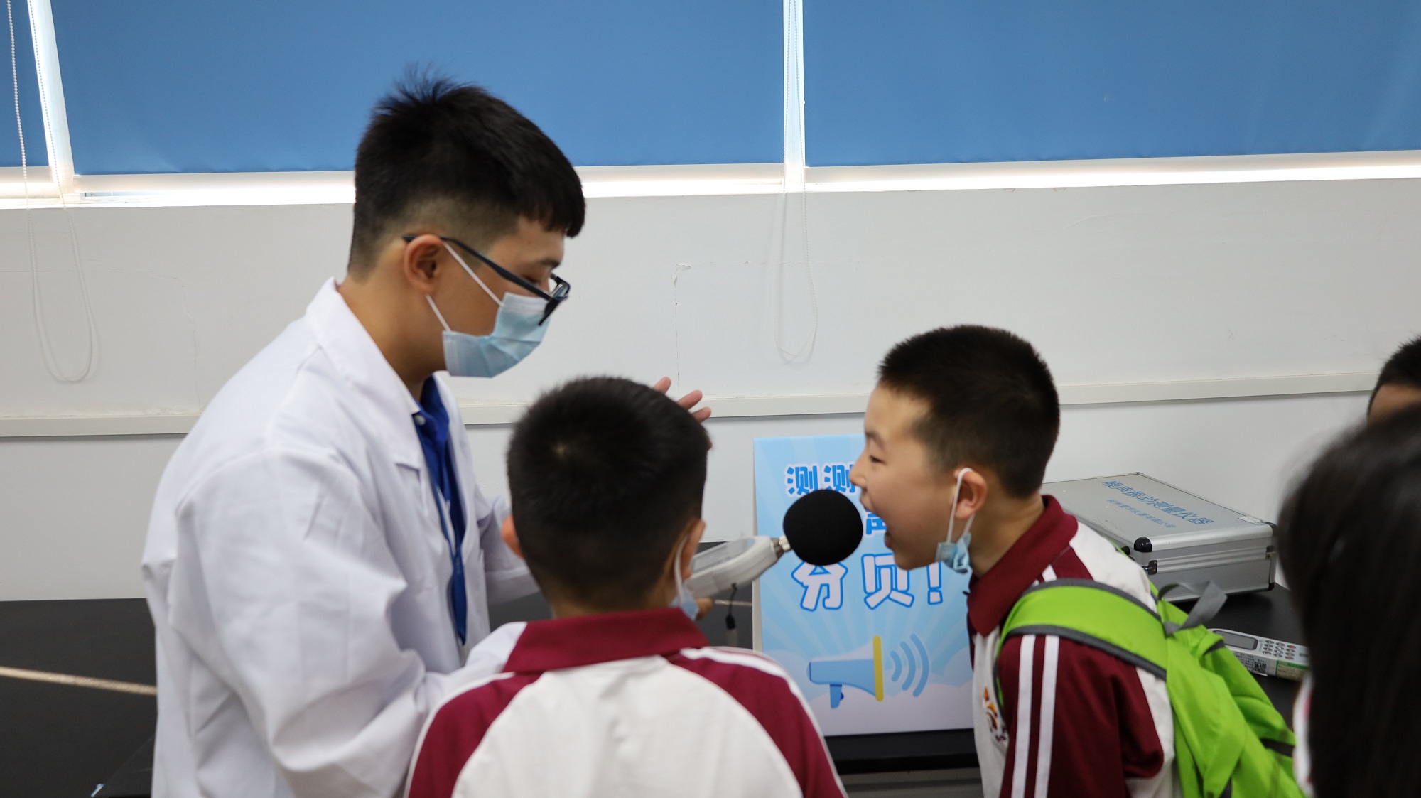 聲音分貝測試環節,小學生們排隊依次體驗不同強度聲音的分貝數值