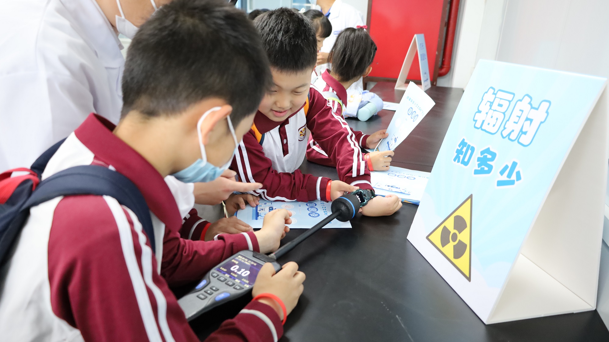 科普互動環節,“探秘團”在技術人員的帶領下,分別觀看并體驗了輻射檢測、聲音分貝測試、微生物觀測、滴定變色等多個科普小實驗。“礦泉水是酸性還是堿性?”“電話手表的輻射有多大?” “乳桿菌是有益菌嗎?”互動過程中,小學生們不僅親自動手體驗,還紛紛提出自己的思考和疑問,技術人員們也都一一耐心解答。