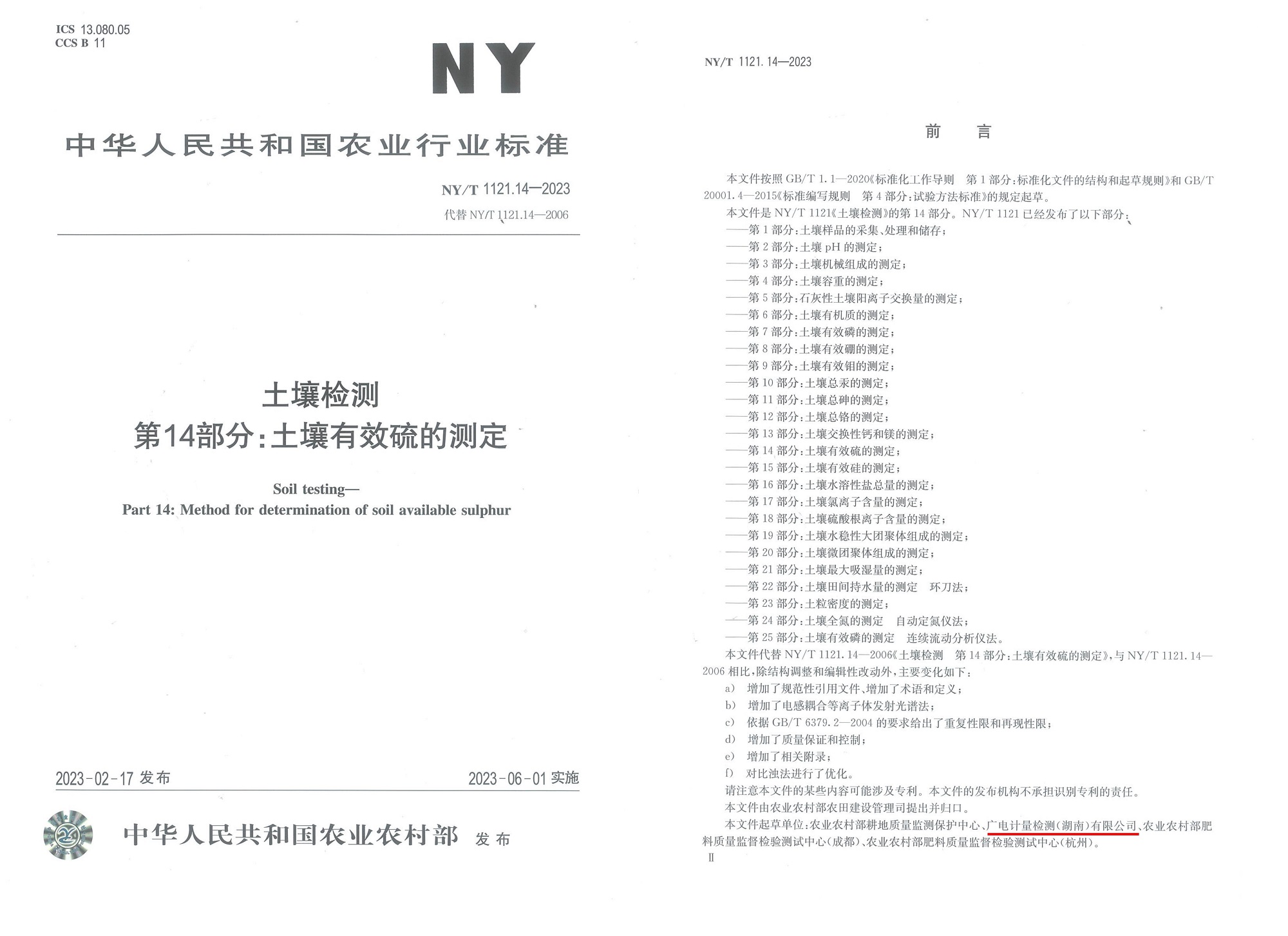 近日,農業農村部發布了中華人民共和國農業農村部公告第651號,《農作物種質資源庫操作技術規程 種質圃》等96項標準將于 2023年6月1日起實施。其中包括廣電計量檢測集團股份有限公司旗下子公司——河南廣電計量檢測有限公司、廣電計量(湖南)檢測有限公司參與起草的NY/T 1121.9—2023《土壤檢測 第9部分:土壤有效鉬的測定》和NY/T 1121.14—2023《土壤檢測 第14部分:土壤有效硫的測定》兩項行業標準。
