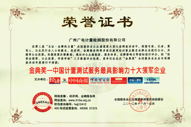 11月18日,在北京人民大會堂隆重召開的第三屆“見證品牌的力量”全國服務業公眾滿意度大型公益調查揭曉新聞發布會上,GRGT被評為“中國計量測試服務最具影響力十大領軍企業”。