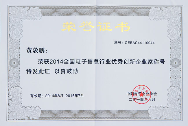 8月9-10日,由中國(guó)電子企業(yè)協(xié)會(huì)、滇中產(chǎn)業(yè)聚集區(qū)(新區(qū))管理委員會(huì)聯(lián)合舉辦的“跨界創(chuàng)新科學(xué)發(fā)展——企業(yè)家活動(dòng)日暨2014全國(guó)電子信息行業(yè)優(yōu)秀企業(yè)家表彰大會(huì)”在昆明隆重舉行。GRGT黃敦鵬總經(jīng)理榮獲“2014全國(guó)電子信息行業(yè)領(lǐng)軍優(yōu)秀創(chuàng)新企業(yè)家”稱號(hào)。