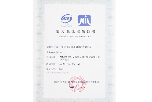 GRGT近期收到北京中實(shí)國(guó)金國(guó)際實(shí)驗(yàn)室能力驗(yàn)證研究有限公司關(guān)于“NIL PT-0497-2 低合金鋼中化學(xué)成分分析(國(guó)際比對(duì))”能力驗(yàn)證計(jì)劃結(jié)果通知單,結(jié)果顯示我司化學(xué)分析測(cè)試中心以優(yōu)異成績(jī)通過(guò)本次能力驗(yàn)證。