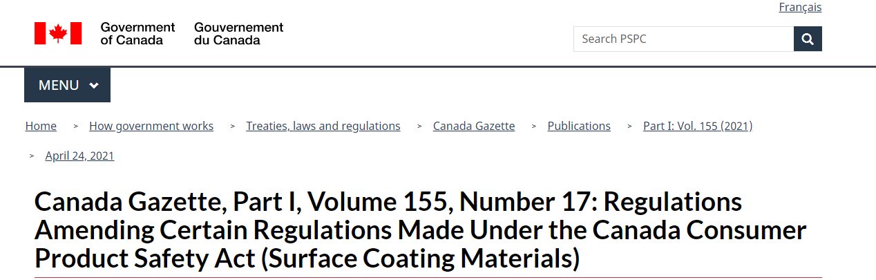 近日,加拿大衛(wèi)生部在官方公報(bào)(Canada Gazette)上發(fā)布加拿大消費(fèi)品安全法案(CCPSA)管控下的表面涂層材料法規(guī)(Surface Coating Materials Regulations)更新的提議,公眾評(píng)議期70天,于2021年7月3日結(jié)束。
