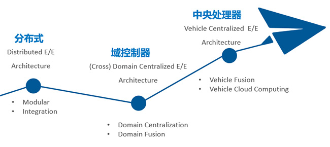 全球最大汽車零部件制造商博世認(rèn)為,電子電氣架構(gòu)將依次經(jīng)歷傳統(tǒng)的分布式、域控制器、中央處理器三個階段的逐漸發(fā)展。從各個模塊相互獨(dú)立,到功能集成,再到域控制器,再到中央控制器,最終到達(dá)云計算。