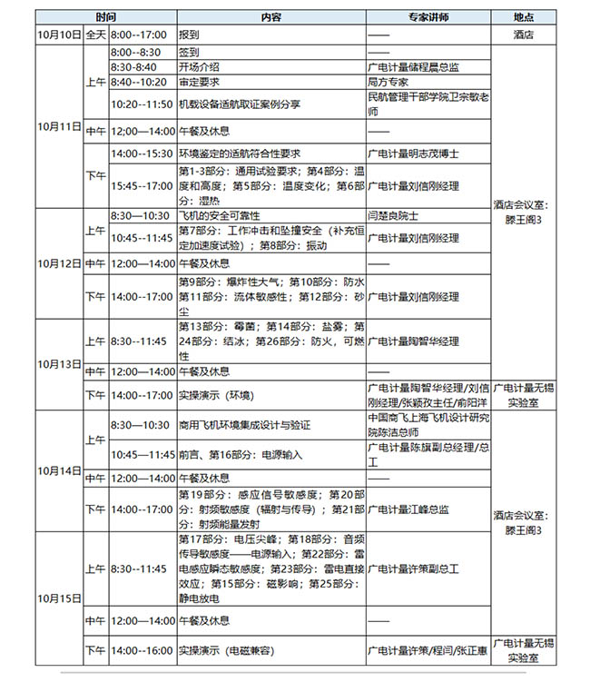 為幫助民航機(jī)載設(shè)備適航管理設(shè)計(jì)、試驗(yàn)測(cè)試等人員提高對(duì)標(biāo)準(zhǔn)的認(rèn)識(shí)水平,廣電計(jì)量將于10月11-15日在無(wú)錫舉辦RTCA DO-160G《機(jī)載設(shè)備環(huán)境鑒定和試驗(yàn)程序》標(biāo)準(zhǔn)培訓(xùn),通過(guò)基本技術(shù)內(nèi)容、試驗(yàn)案例和實(shí)際操作演示相結(jié)合的方式,為參訓(xùn)人員提供全面、深入的試驗(yàn)標(biāo)準(zhǔn)解讀以及與需求、設(shè)計(jì)、適航和技術(shù)標(biāo)準(zhǔn)規(guī)定(TSO/ETSO/CTSO)相適合的全局理解。