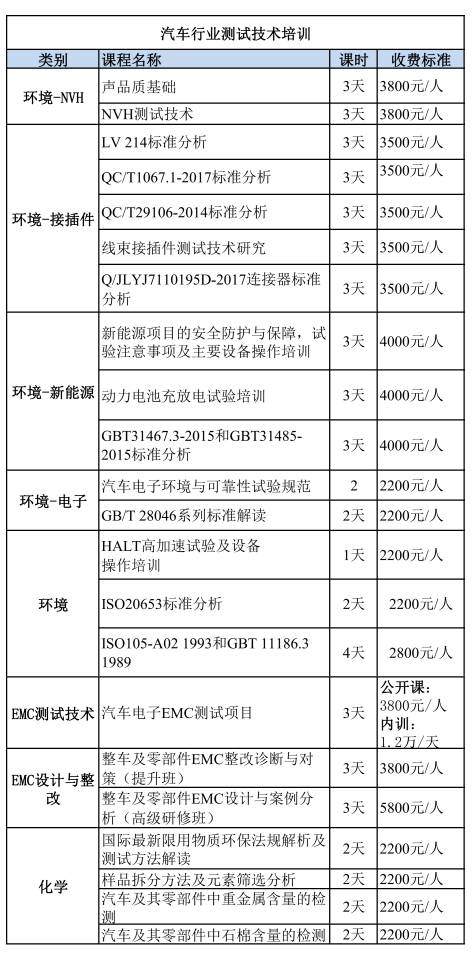 課程體系主要涵蓋:汽車行業(yè)的環(huán)境可靠性檢驗(yàn)技術(shù)(包括:環(huán)境-NVH、環(huán)境-接插件、環(huán)境-電子等)、EMC檢測(cè)(包括:EMC測(cè)試技術(shù)、EMC設(shè)計(jì)基整改等)、化學(xué)檢測(cè)等多個(gè)類別。
