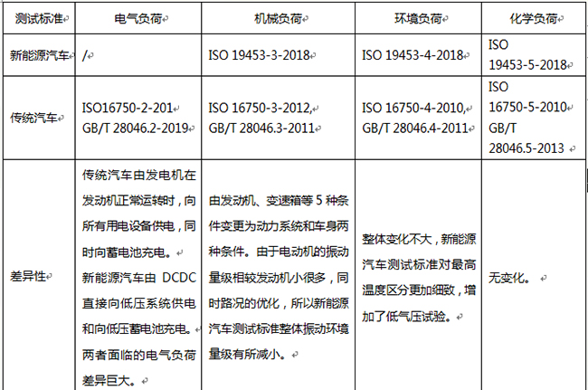 與傳統汽車相比,新能源汽車的使用環境有較大改變,傳統汽車測試的方法標準中的電氣負荷和機械負荷與新能源汽車差別較大。