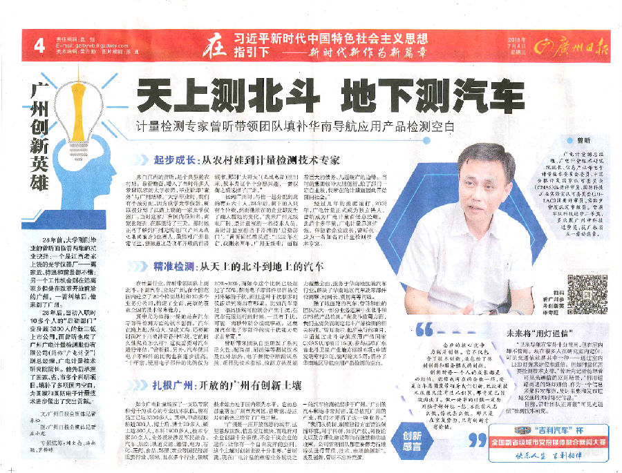近年來(lái),廣電計(jì)量以創(chuàng)新驅(qū)動(dòng)發(fā)展,強(qiáng)化機(jī)制創(chuàng)新、管理創(chuàng)新、技術(shù)創(chuàng)新,邁入高速發(fā)展軌道,成為國(guó)有檢測(cè)機(jī)構(gòu)市場(chǎng)化運(yùn)作的先行者,在多個(gè)計(jì)量檢測(cè)技術(shù)領(lǐng)域位居行業(yè)前列,涌現(xiàn)出一大批優(yōu)秀創(chuàng)新人才。日前,公司副總經(jīng)理、技術(shù)研究院院長(zhǎng)曾昕作為計(jì)量檢測(cè)行業(yè)技術(shù)專家、公司的技術(shù)創(chuàng)新代表,接受了《廣州日?qǐng)?bào)》專訪,回顧了十八年如一日奮斗在計(jì)量檢測(cè)技術(shù)研發(fā)一線的歷程,分享了創(chuàng)新心得,介紹了公司在軍民融合、汽車、航空、軌道交通等國(guó)民經(jīng)濟(jì)重要行業(yè)、領(lǐng)域取得的技術(shù)創(chuàng)新成果。