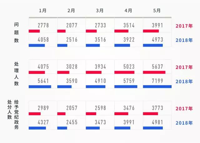 仔細梳理發現,今年1-5月,每月全國查處違反中央八項規定精神問題數、處理人數、給予黨紀政務處分人數相比去年同期均大幅上升。此外,除2月有下降外,1-5月的各項數據呈逐月攀升趨勢。