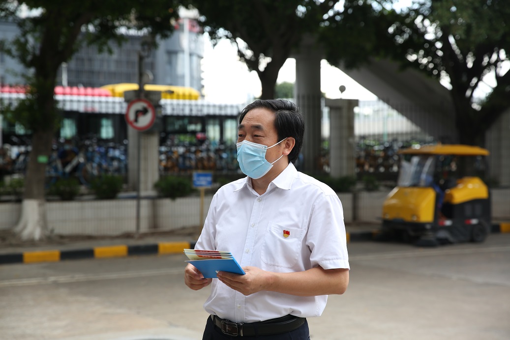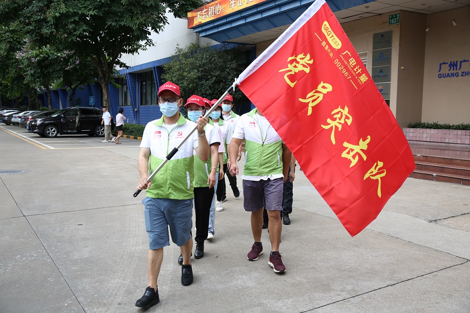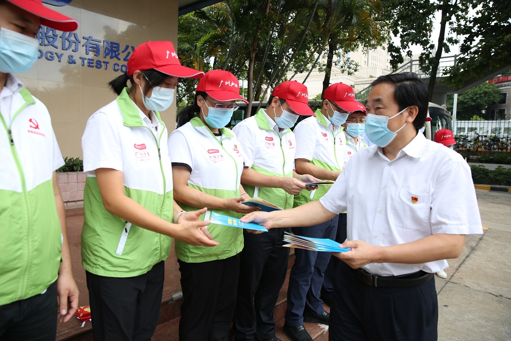 (照片組圖:6月10日,廣電計(jì)量黨委書記、總經(jīng)理黃敦鵬,黨委副書記白云對黨員突擊隊(duì)志愿者進(jìn)行動(dòng)員講話,鼓勵(lì)志愿者努力為廣州疫情防控工作做出更大貢獻(xiàn),并叮囑大家做好自身防護(hù)。志愿者們扛著黨旗,以飽滿的熱情投入支援荔灣全員核酸檢測的工作中。)