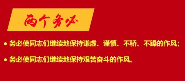 習(xí)近平總書記強調(diào):“對毛澤東同志提出‘兩個務(wù)必’的深邃思想和戰(zhàn)略考慮,我們要不斷學(xué)習(xí)領(lǐng)會。我們要不斷向全黨嚴(yán)肅鄭重地提出這個問題,始終做到謙虛謹(jǐn)慎、艱苦奮斗,使我們的黨永遠(yuǎn)不變質(zhì)、我們的紅色江山永遠(yuǎn)不變色。”牢記是為了更好出發(fā)。只有始終牢記全心全意為人民服務(wù)的宗旨,才能始終同人民風(fēng)雨同舟、領(lǐng)航中國號巨輪破浪前行;只有保持謙虛、謹(jǐn)慎、不驕、不躁的作風(fēng),只有保持艱苦奮斗的作風(fēng),才能始終同人民密切聯(lián)系在一起,在這場歷史性考試中經(jīng)受考驗,不斷向歷史、向人民交出新的更加優(yōu)異的答卷。