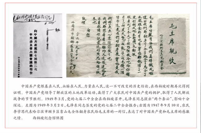——彰顯為了人民、依靠人民的人民情懷。中國共產(chǎn)黨根基在人民、血脈在人民、力量在人民。展覽中展示了這樣一封書信,信中寫道:“毛主席呀,沒有您我們真得餓死啦。這回我們都翻身了,分了地,分了馬,分了衣服、糧食,都有吃有穿,也都抱團了……”這封信是東北翻身農(nóng)民寫給毛主席的,已經(jīng)成為我們黨一切為了人民、一切依靠人民的歷史見證。全國土地會議景觀、參加全國土地會議的部分人員名單、部分代表在土地會議上的發(fā)言稿、老農(nóng)民在土墻上書寫的《中國土地法大綱》照片、“土地回老家”錦旗……眾多展品生動詮釋了黨在西柏坡的歷史,就是全心全意為人民服務(wù)的歷史。支前民工的立功喜報,用過的推車、紡線車,“運糧先鋒”的獎旗……人民群眾踴躍參軍參戰(zhàn)、繳糧支前,為人民軍隊提供了源源不斷的人力物力,大大加快了解放戰(zhàn)爭勝利和新中國建立的步伐。黨為了人民、依靠人民的文物、史料和真實記錄,可以啟迪干部群眾深切感受到,黨始終堅持全心全意為人民服務(wù)的根本宗旨,人民群眾的擁護和支持是我們黨最堅實的根基。