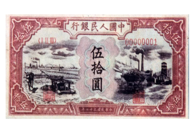 1948年12月1日,中國人民銀行發(fā)行第一套人民幣,“中國人民銀行”六個字由當(dāng)時的華北人民政府主席董必武同志題寫。第一批發(fā)行的人民幣有10元、20元和50元三種券別,首先在華北、山東和西北三大解放區(qū)流通使用。圖為50元一號人民幣。西柏坡紀念館供圖