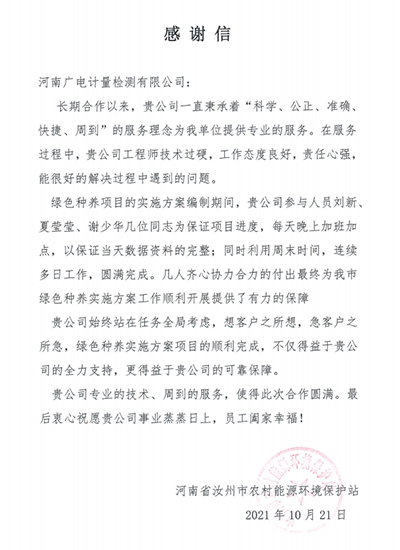 在汝州項目保障期間,時間緊,任務重,天氣突變,而劉新前一天晚上堅持工作到凌晨3點,第二天清早又趕到客戶辦公室,最終體力不支病倒了,團隊的同事們紛紛送上關切的問候,讓她回去休息,但劉新仍然堅持留在工作現場做好技術指導與工作協調,她的拼勁為團隊注入強大的精神動力,大家一起堅守趕制完成報告,團隊又連夜從汝州趕回鄭州,陪同客戶如期將報告提交到政府主管部門。最終,試點實施方案順利通過,廣電計量的綜合能力獲得認可,并收到了客戶表揚信。