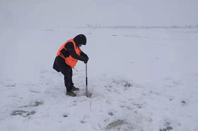 攻關(guān)組組員迎著寒風(fēng)在冰封的河面上采樣