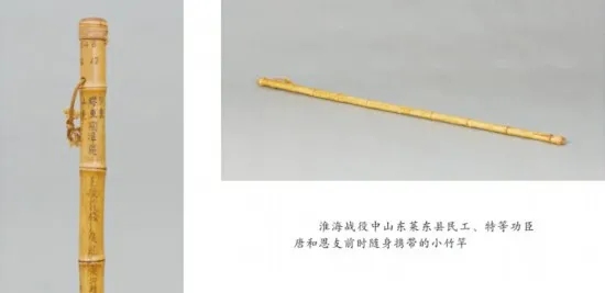 解放戰爭中,人民解放軍的交通運輸條件十分落后,廣大人民用肩挑、車推、驢馱、船運等方法,從千里之外將大量的糧食、彈藥等軍需物資源源不斷地運到前線,將傷病員送往后方醫治。在中國共產黨歷史展覽館陳列著一件山東農民唐和恩千里支前路上使用過的小竹竿,小竹竿長106cm,直徑約為2.5cm,屬國家一級文物,是山東省萊東縣支前民工唐和恩在支前路上支撐走路使用的。支前道路崎嶇,唐和恩走累了就拿小竹竿當拄棍,遇有河流阻擋,就用小竹竿來探深淺,風雪淤泥中用小竹竿尋道路。有時候遇到國民黨軍的轟炸,他就在小竹竿上綁上樹枝和茅草偽裝防空;翻山越嶺他就把小竹竿高高舉過頭頂在最前面引路。戰役中,唐和恩幾乎跑遍了整個淮海戰場,每到一地,他就把地名刻在小竹竿上,共刻下了山東、安徽、江蘇3個省88個城鎮和村莊的名稱,行程長達5000余里。一件小小竹竿銘刻了偉大的支前路,也充分顯示了人民戰爭的巨大威力。