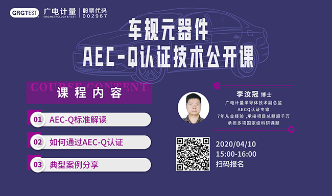 4月10日(本周五15:00-16:00),廣電計量李汝冠博士為您帶來車規(guī)元器件AEC-Q認(rèn)證技術(shù)公開課,助您通過AEC-Q認(rèn)證,歡迎各位朋友掃碼報名!